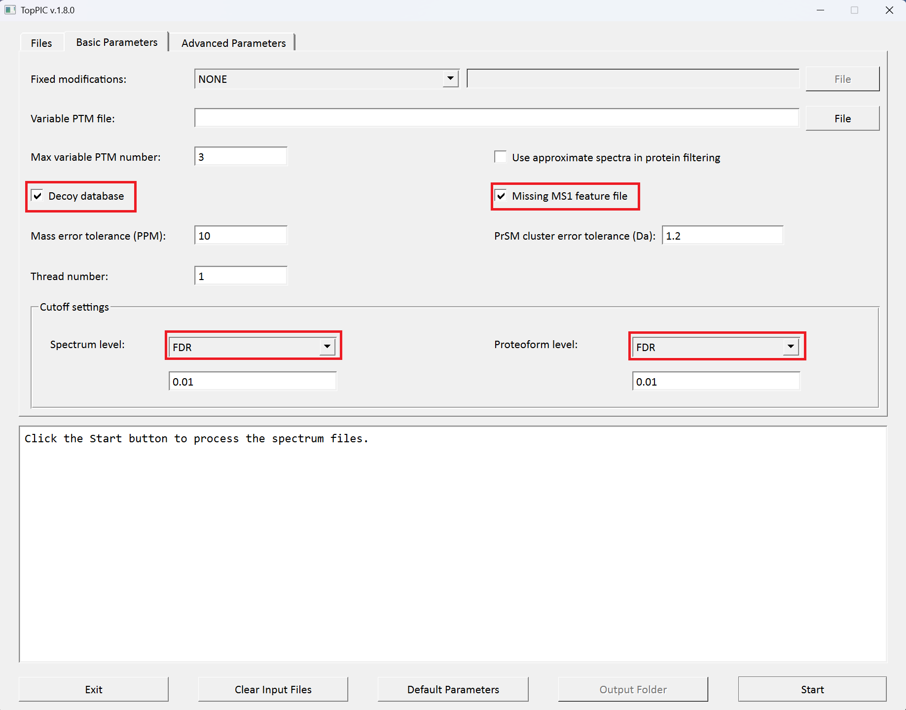 as the mass spectrum data file. Decoy database. MS1 feature is missing. FDR as the spectrum level cutoff type. FDR as the proteoform level cutoff type.