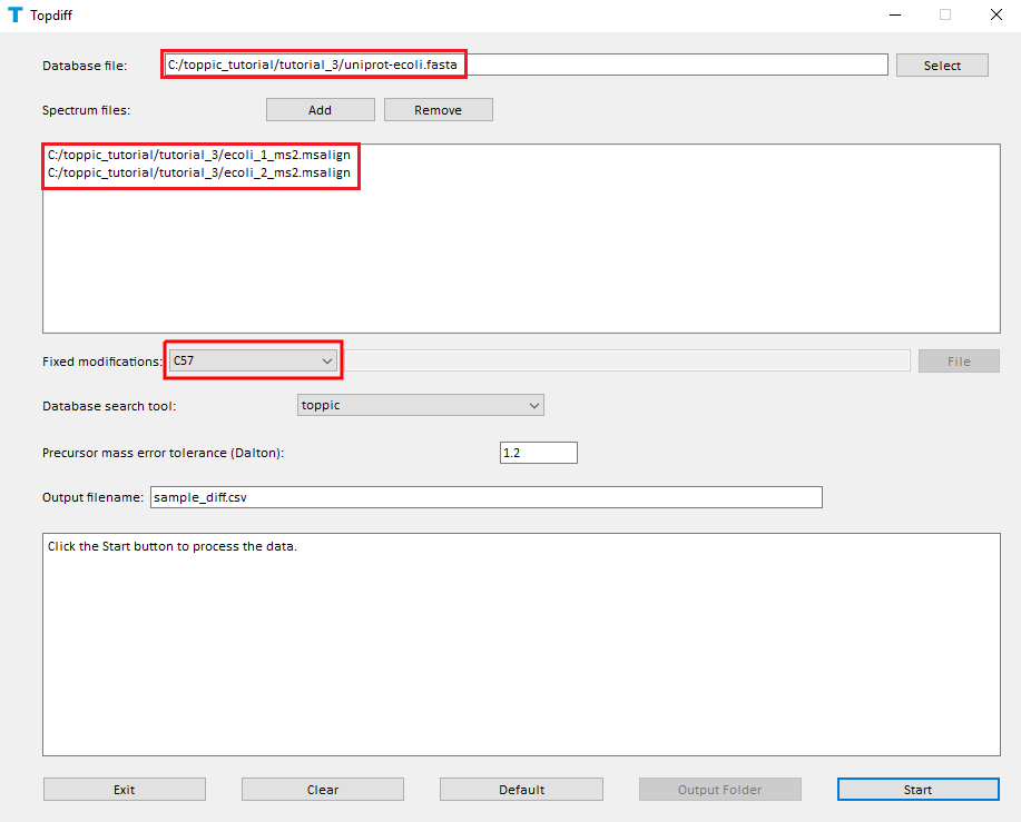 We will use TopPIC and TopDiff to compare the abundance of proteoforms and find differentially expressed proteoforms using two MS data files of Escherichia coli cells (ecoli_1.raw and ecoli_2.raw).