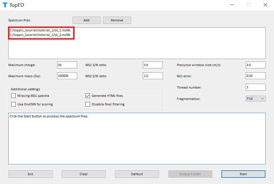 C:\toppic_tutorial\tutorial_1\st_2.mzMLThe sizes of the two files are about 41 MB and 47 MB, respectively. They can be downloaded here. The running time for the file format conversion is less than one minute.