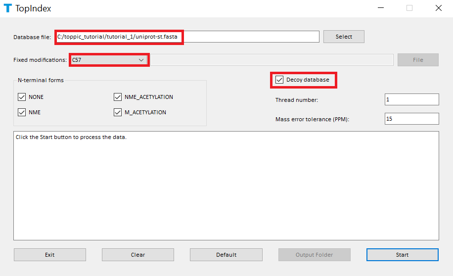 To speed up database search, follow the steps in Section 4.2.1 to generate index files for the database file uniprot-st.fasta. If index files have been generated, it is not necessary to regenerate index files. You can copy the index folder to the folder C:\toppic_tutorial\tutorial_2\.