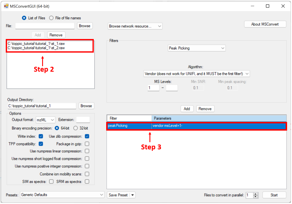 We use MSConvertGUI to convert the raw files st_1.raw and st_2.raw to mzML files.