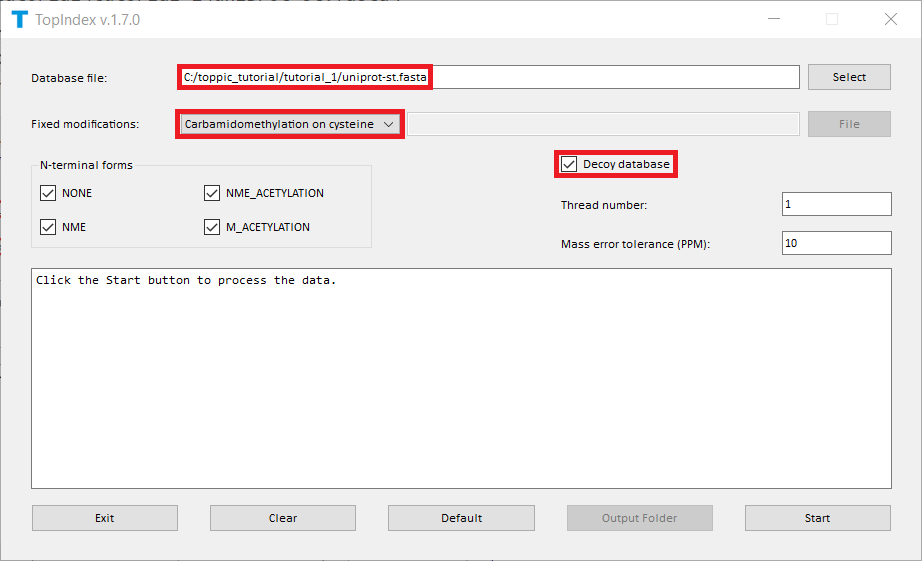 To speed up database search, follow the steps in Section 4.2.1 to generate index files for the database file uniprot-st.fasta. If index files have been generated, it is not necessary to regenerate index files. You can copy the index folder to the folder C:\toppic_tutorial\tutorial_2\.