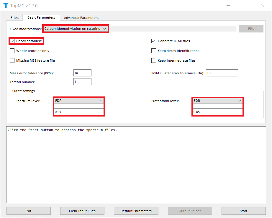 mass spectrum data files. Carbamidomethylation on cysteine as the fixed modification. Decoy database. FDR as the spectrum level cutoff type. FDR as the proteoform level cutoff type.