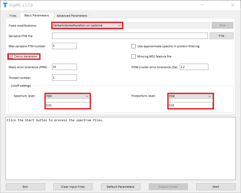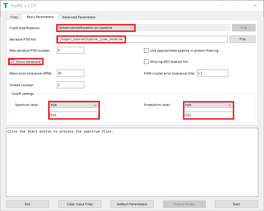 mass spectrum data file. C:\toppic_tutorial\tutorial_2\variable_mods.txt as the file of variable PTMs. Carbamidomethylation on cysteine as the fixed modification. Decoy database. FDR as the spectrum level cutoff type. FDR as the proteoform level cutoff type.