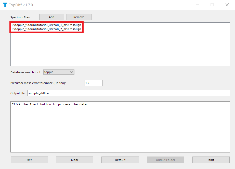We will use TopPIC and TopDiff to compare the abundance of proteoforms and find differentially expressed proteoforms using two MS data files of Escherichia coli cells (ecoli_1.raw and ecoli_2.raw).